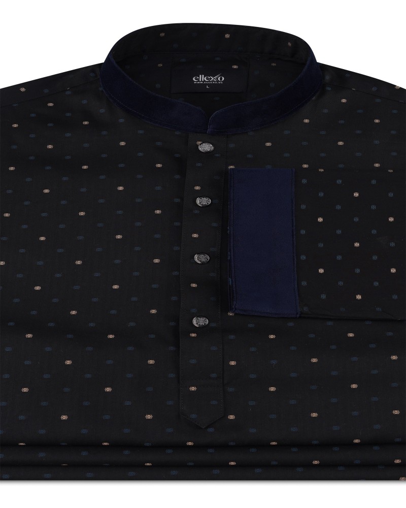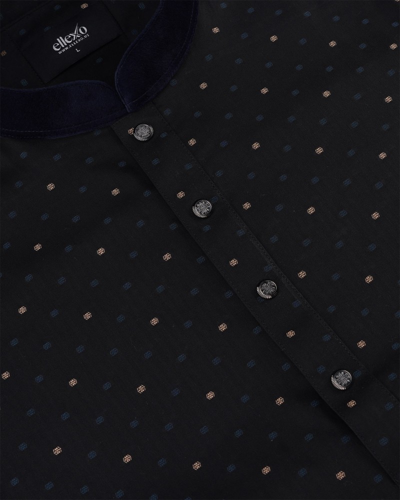Indulge in the epitome of luxury with Ellexo’s Luxury Panjabi Collection, designed for the discerning individual. Made from the finest jacquard-woven, yarn-dyed cotton, this masterpiece radiates a subtle gloss in the mesmerizing wavy shades of teal and olive. Adorned with elegant damask patterns and the signature Ellexo buttons in black and gold, this panjabi is the perfect blend of classic charm and contemporary luxury.